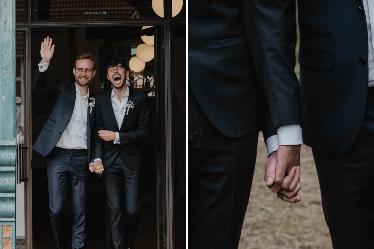 Es mag trotzig klingen, aber wir wollten es uns dennoch nicht nehmen lassen, noch in diesem Jahr zu heiraten. Da wir an einem 13. unsere erste Verabredung hatten, war es uns wichtig, dass die Trauung auch am 13. eines Monats stattfinden würde, am liebsten im Mai. Diesen Termin hatten wir und wollten ihn auch nicht verfallen lassen. Darum haben wir gesagt: Wir machen das jetzt – ganz egal, wie der Tag aussehen wird. Und obwohl wir nicht mal wussten, wen wir überhaupt ins Standesamt mitnehmen dürfen. Aber dass unsere Familien nicht dabei sein würden, stand leider ohnehin fest: Denn sie wohnen teilweise sehr weit weg oder gehören zur Risikogruppe. Eine Woche vor dem Termin kam dann die Nachricht, dass wir immerhin vier Leute mit ins Standesamt in Jork in der Nähe von Hamburg nehmen können, wir mit bis zu zehn Personen draußen anstoßen dürfen. Als wir nach der Trauung rauskamen, waren vier Freunde als Überraschung gekommen, zwei sogar extra aus Berlin – nur um uns einmal einen Luftkuss zuzuwerfen!