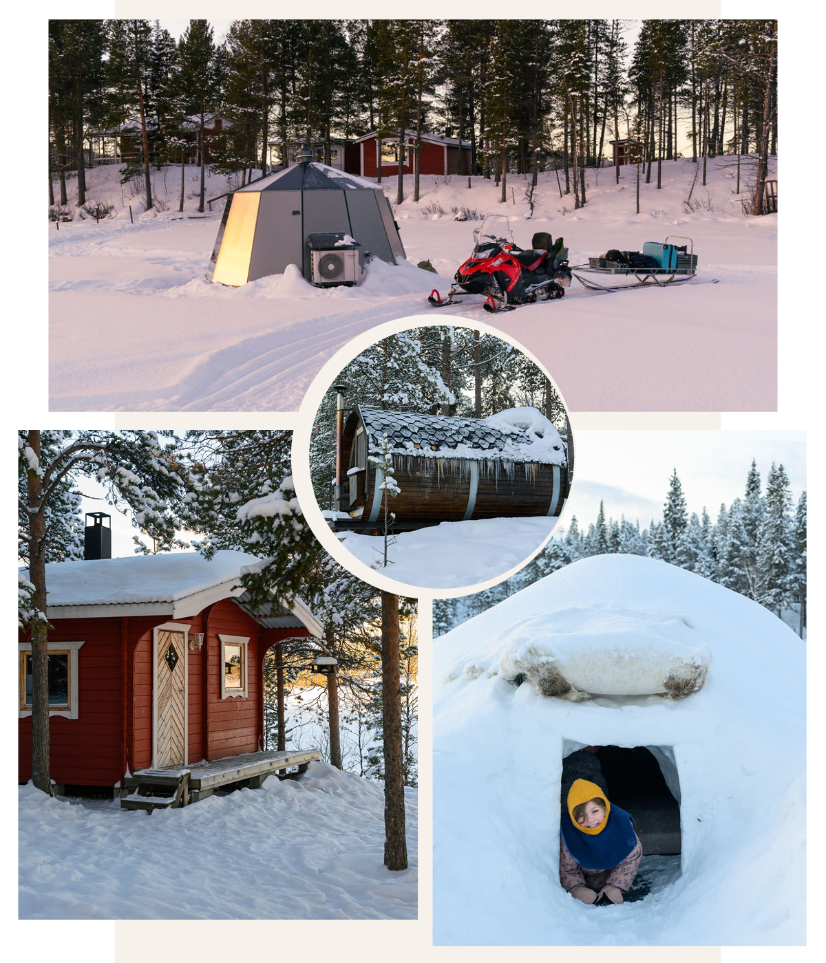 Auf dem Eis tranken wir Erwachsenen unseren ersten Kaffee des Tages. Die Kinder spielten in den Iglus, die das Camp tatsächlich an Gäst*innen vermietet, um auf dem zugefrorenen See in einer Höhle aus Schnee zu schlafen. Wir spazierten auf dem Eis einmal um das Camp herum, um die „Aurora Huts“ anzuschauen.