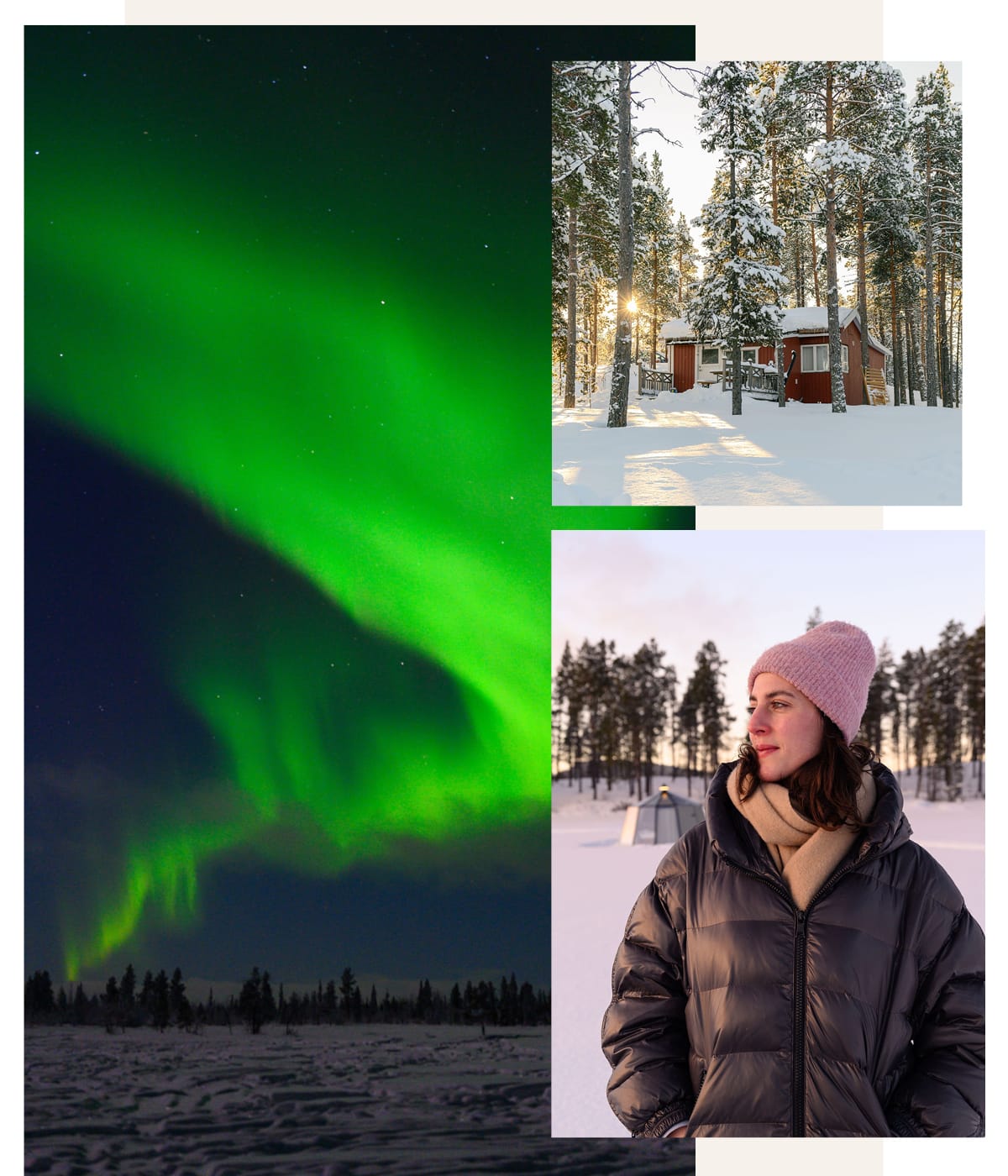 Aurora Camp Kurravaara, nicht weit von Kiruna, eine Flugstunde von Stockholm entfernt. Das Camp überzeugte mich mit seinem Mix aus roten Schwedenhäusern und gläsernen Aurora-Hütten, die am Flussufer des Torneträsk-Sees auf Stelzen ins Wasser gebaut waren. Auf einer Internetplattform bewarben Fotos die Aussicht auf Nordlichter, die zwischen November und März den Himmel färbten; ebenfalls reizte mich die Idee einer eigenen Sauna, die zur Hütte gehörte.