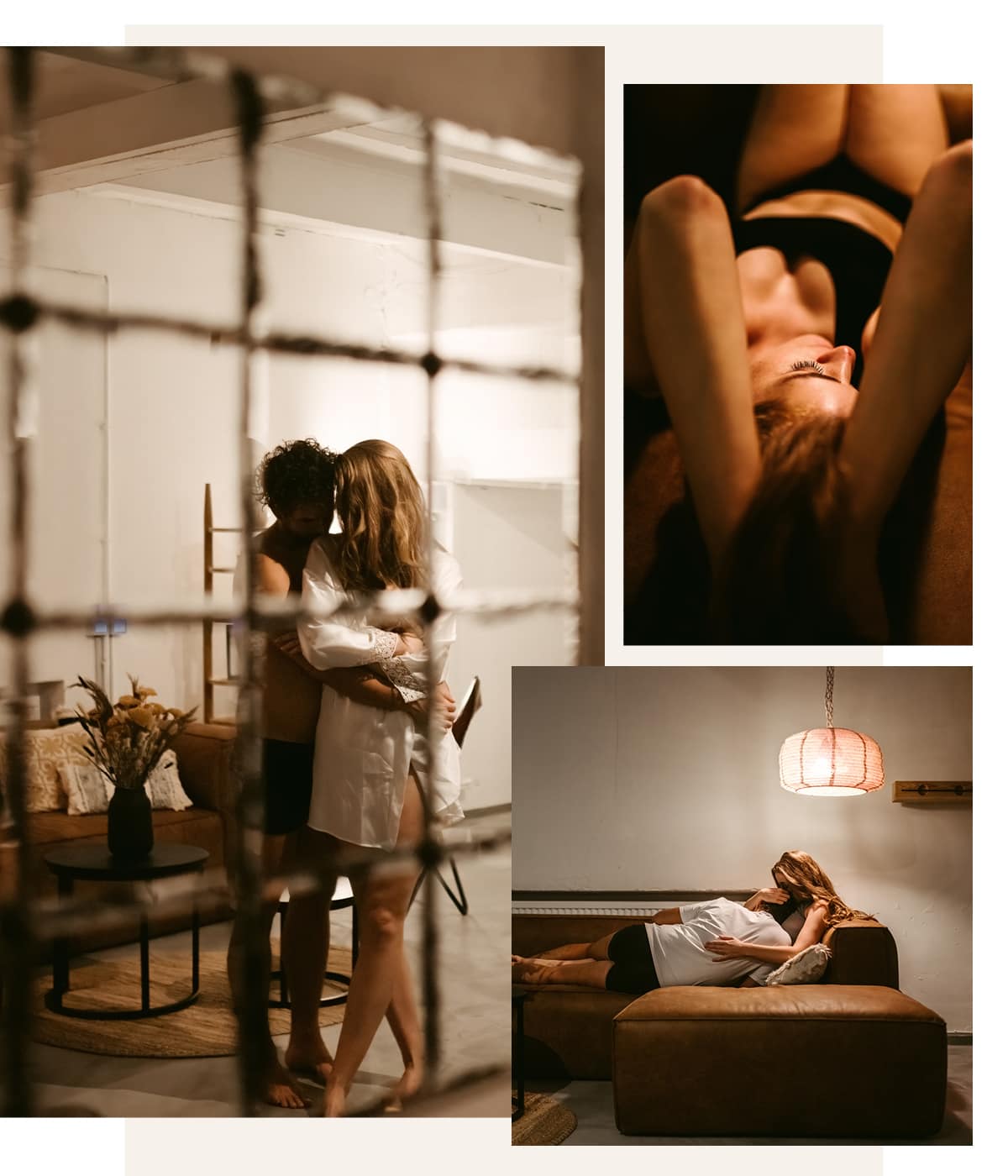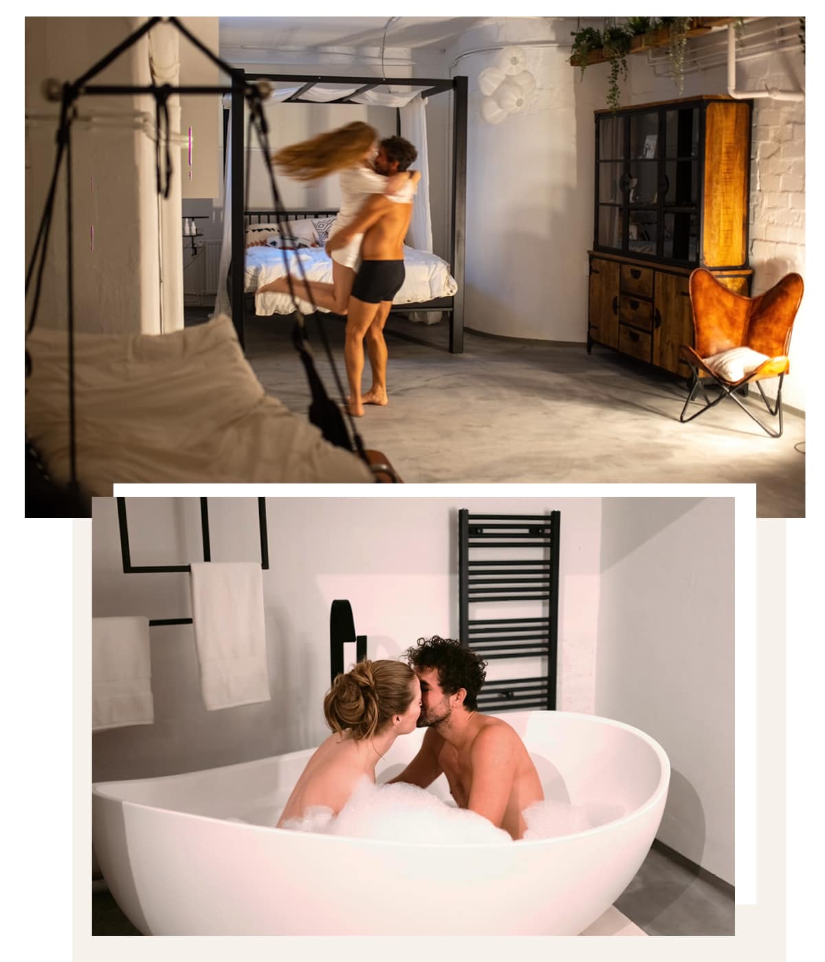 Ich könnte nicht aufgeregter sein, als ich an diesem Sonntagabend an der Location klingele. Die Tür öffnet sich. Beide sind da. Die Stimmung zwischen ihnen scheint gut. Und ich kann nicht mehr aufhören zu lächeln. Der Champagner ist schon offen, bis sich die schlimmste Aufregung legt, schlendern wir durch das Studio. Es besitzt eine freistehende Badewanne, eine Regendusche, ein separates Bad, ein riesiges Bett. Eine Liebesschaukel und ein Andreaskreuz. Obwohl sich diese zwei letzten Dinge definitiv um das Thema Sex drehen, wirken sie trotzdem nicht aufdringlich, eher wie edle Designobjekte. Der Boden ist aus gegossenem Beton und warm. Der ganze Raum strahlt eine Art moderne industrielle Romantik aus: Stahlträger und weiße Leinenbettwäsche – man sieht, dass es hier definitiv zur Sache gehen kann, aber nicht unbedingt muss. Ich mag es, dass die Atmosphäre hier nicht irgendwie merkwürdig ist, nicht puffig oder hardcoresexuell. Es ist eher eine luxuriöse kleine Suite – mit einer Prise Kinkyness.